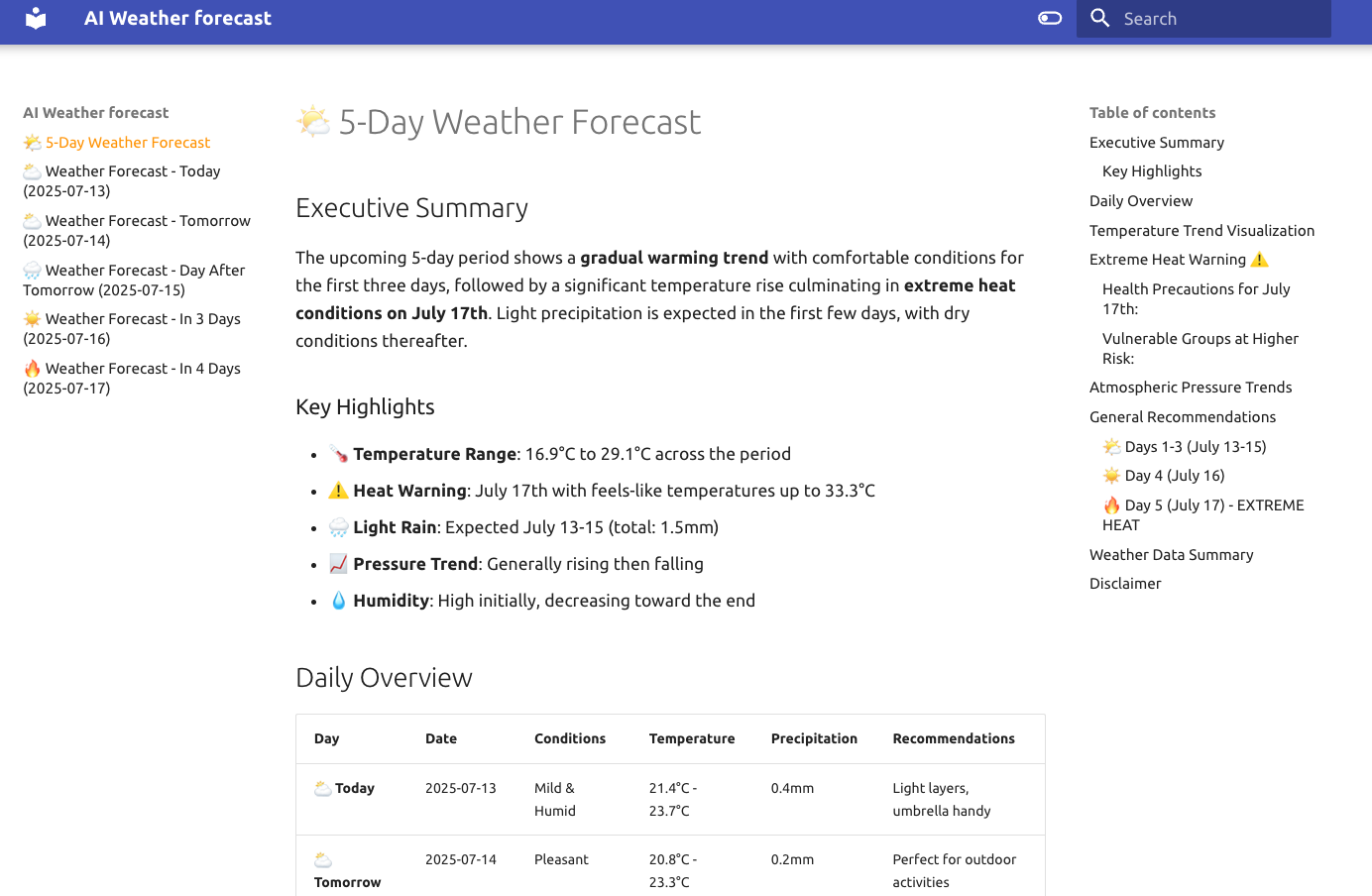 As you can see, the agent is only a few lines of code. The magic is in the prompts and the tools that it uses. The agent can be used to generate weather forecasts, analyze historical weather data, and provide practical recommendations based on the weather conditions. This is the main prompt: