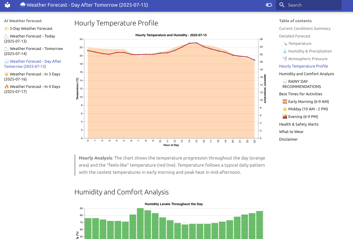 For the visualization I’m using MkDocs , a simple static site generator for Markdown files. To have more advanced visualizations, I’m using the Vega-Lite library, which allows you to create interactive and visually appealing charts. The agent generates the JSON configuration for the graphs in a format compatible with Vega-Lite, which can then be rendered in the Markdown reports.