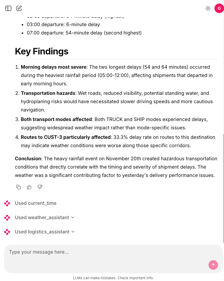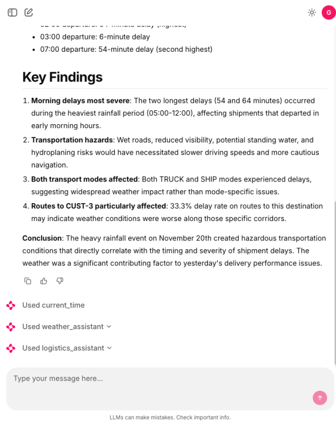 Logistics Agent: Specialist in supply chain and shipping operations. Fake logistics data is generated to simulate shipment tracking, route optimization, and delivery performance analysis.