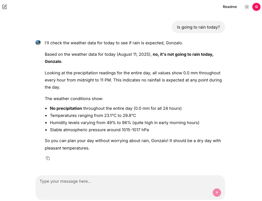 The weather functionality is implemented using custom Strands tools that fetch meteorological data: